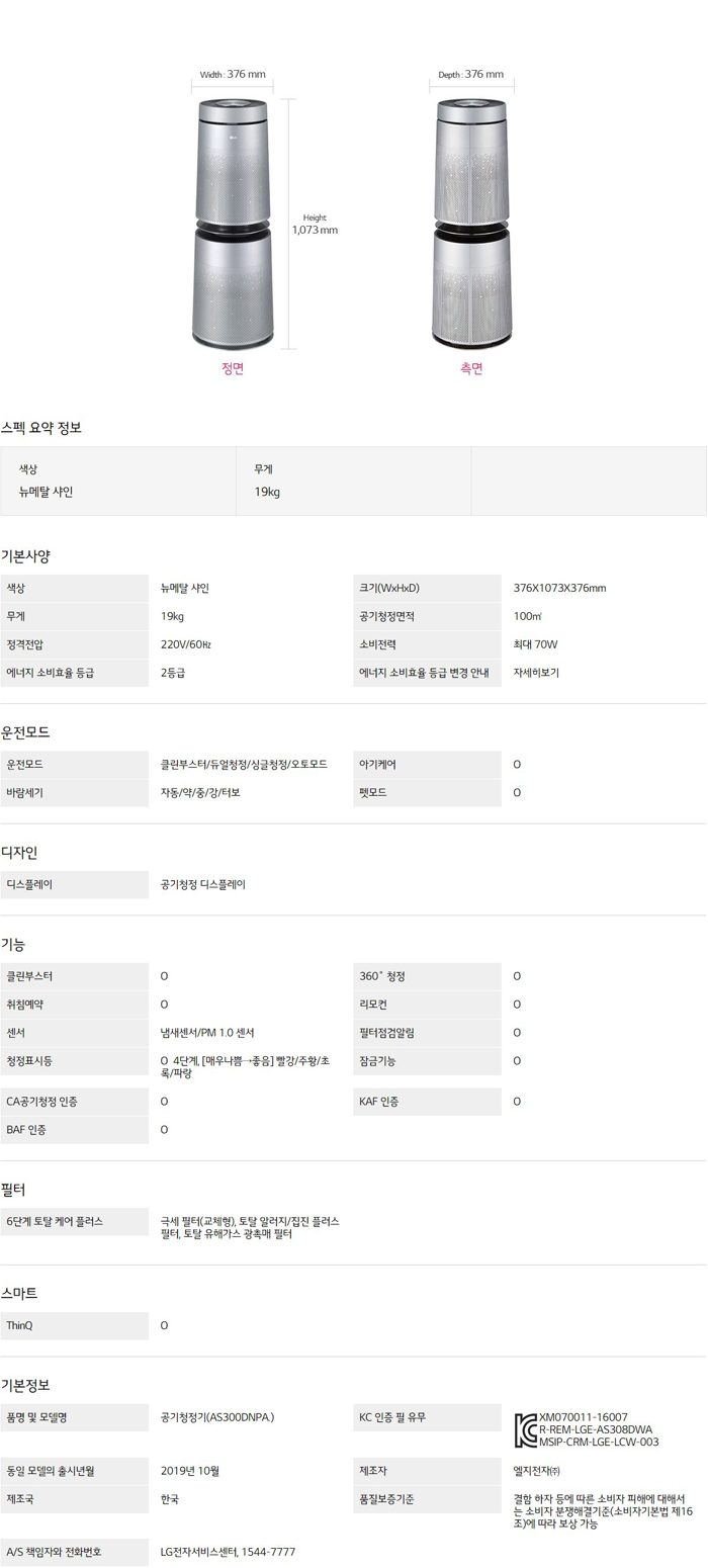 LG 퓨리케어 360˚ 공기청정기 펫 AS300DNPA
