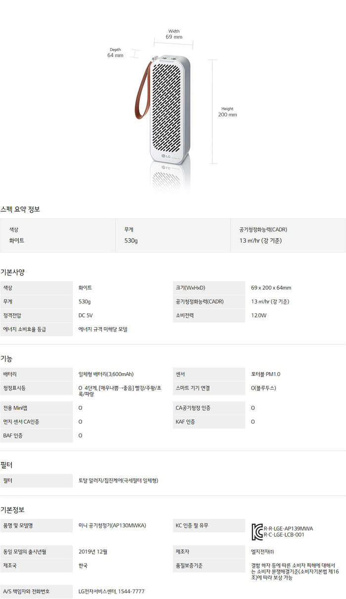 LG 퓨리케어 미니 공기청정기 AP130MWKA