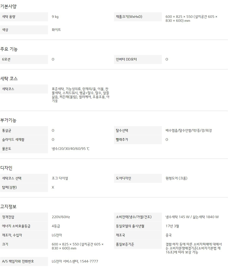 세탁 용량 : 9 kg