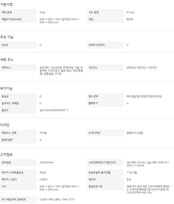 세탁 용량 : 9 kg