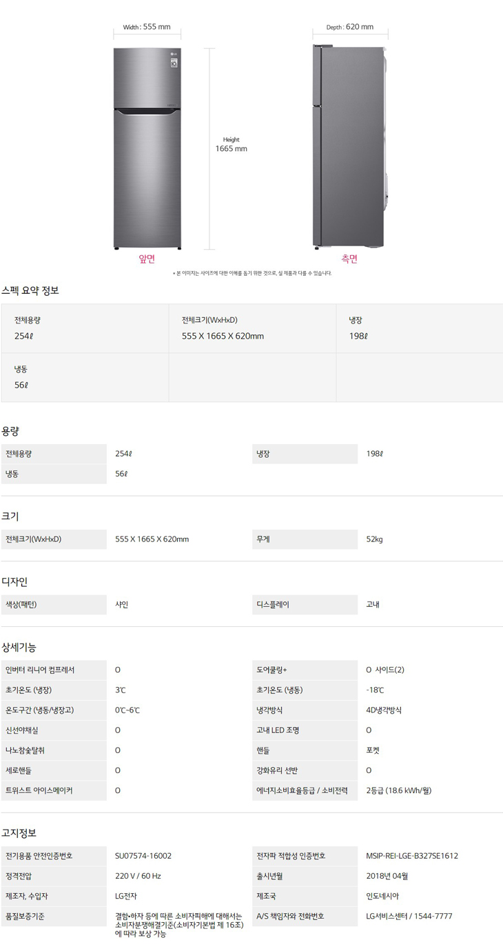 전체크기(WxHxD) : 555 X 1665 X 620 mm