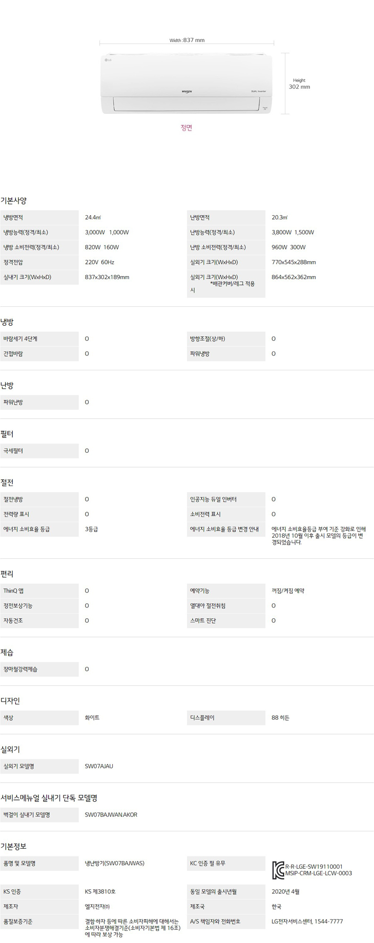 LG 휘센 벽걸이형 냉난방 에어컨 SW07BAJWAS