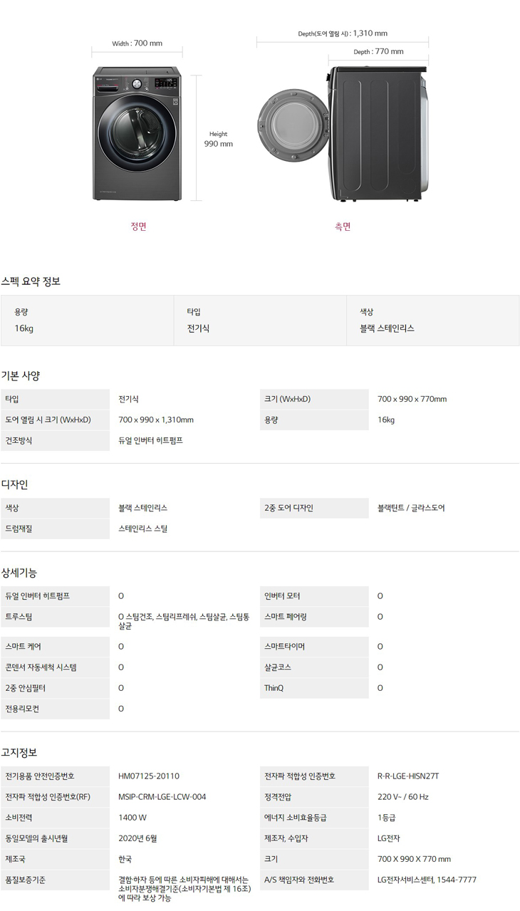 스팀 건조기ThinQ (듀얼 인버터 히트펌프) RH16KT