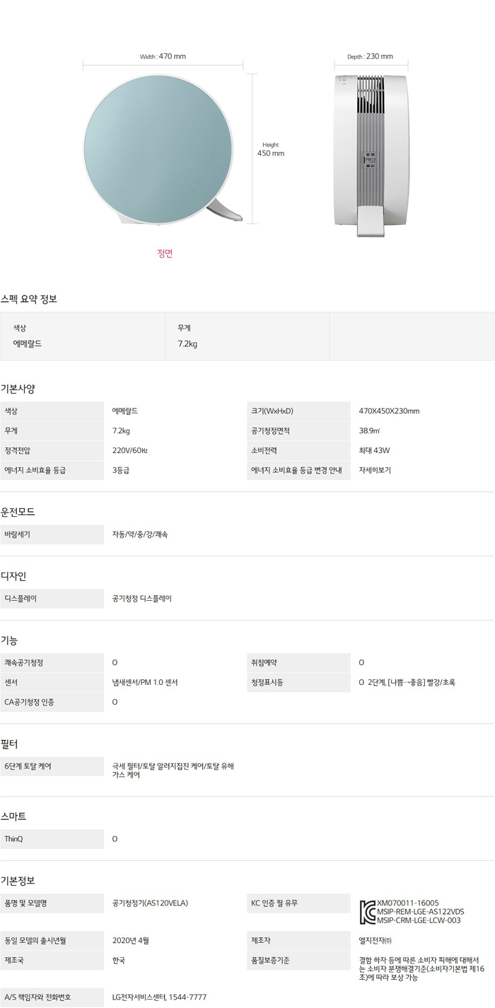LG 퓨리케어 공기청정기 AS120VELA
