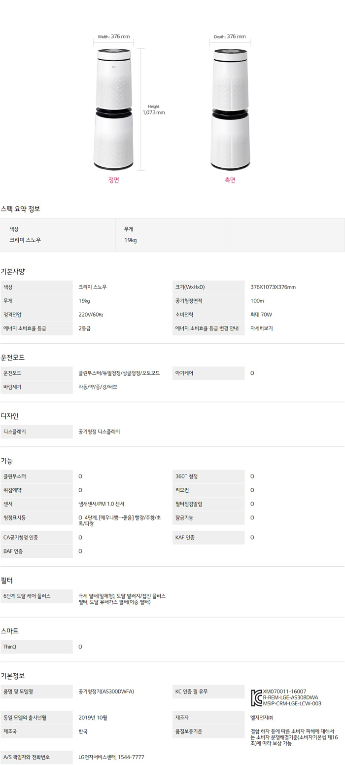 LG 퓨리케어 360˚ 공기청정기 AS300DWFA