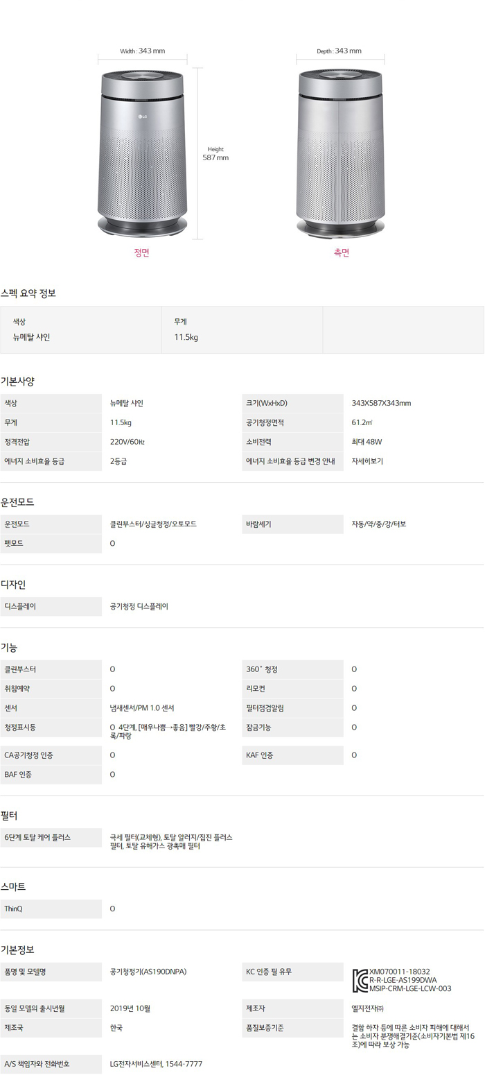 LG 퓨리케어 360˚ 공기청정기 펫 AS190DNPA