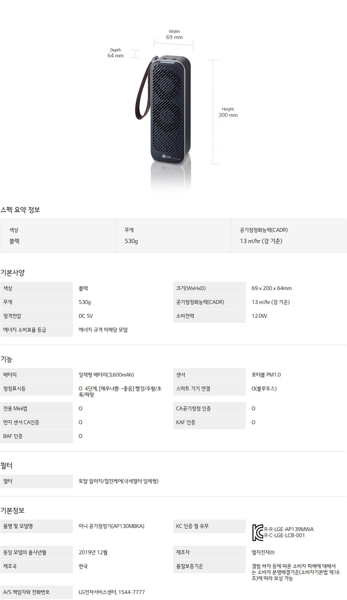 LG 퓨리케어 미니 공기청정기 AP130MBKA