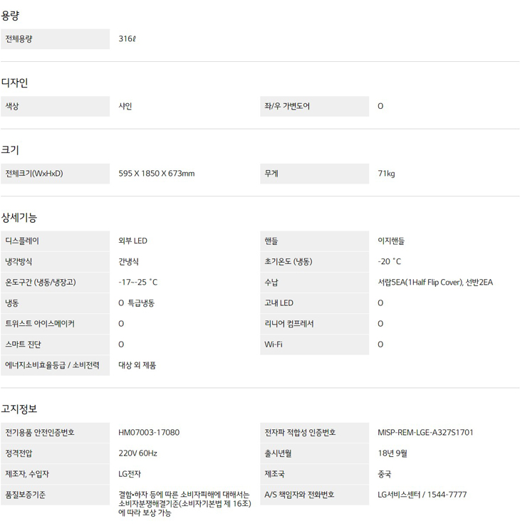 전체용량 : 316 ℓ