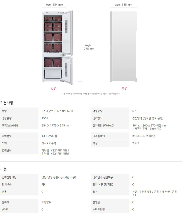 용량 : 223 (상부 156 / 하부 67) L