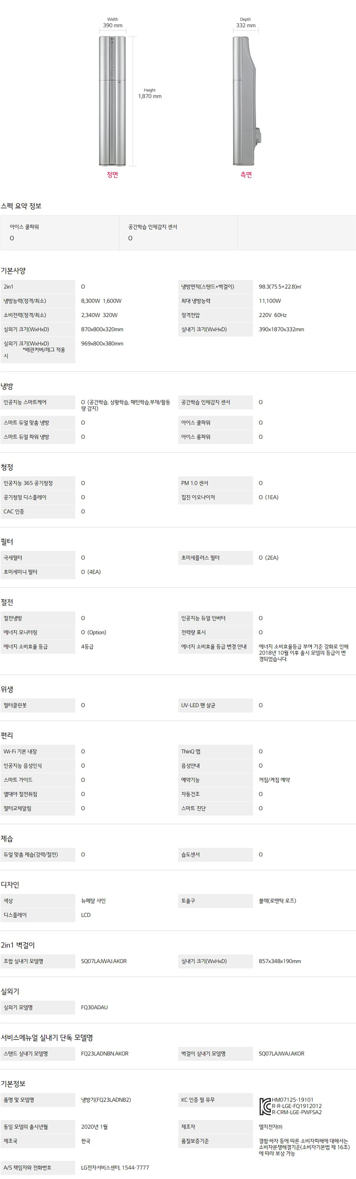 실내기 크기(WxHxD) : 390x1870x332 mm