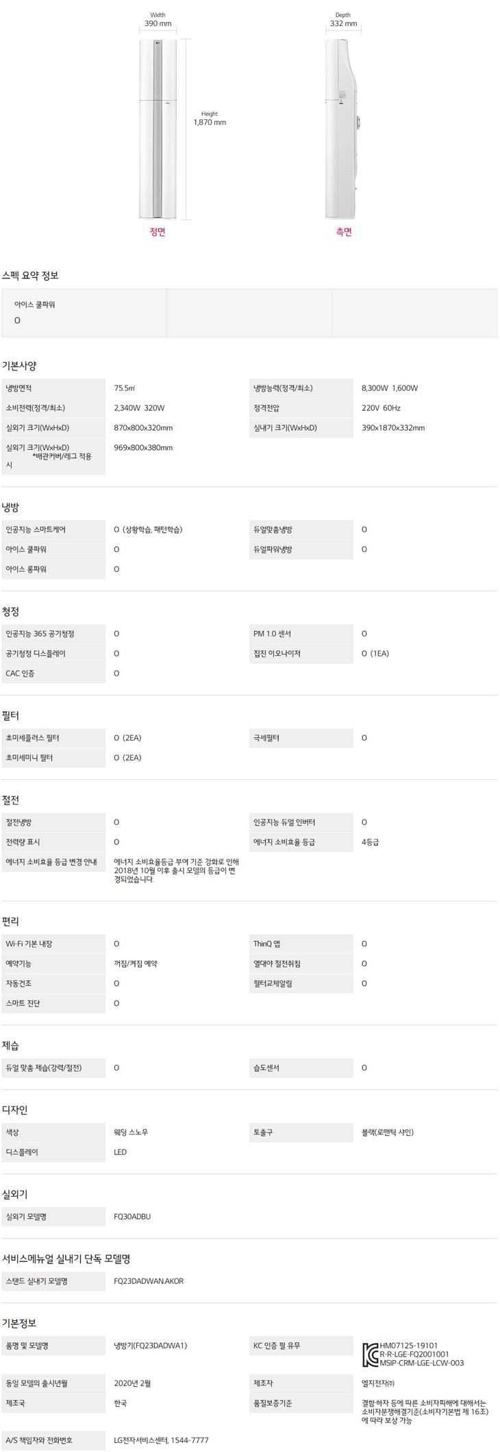실내기 크기(WxHxD) : 390x1870x332 mm