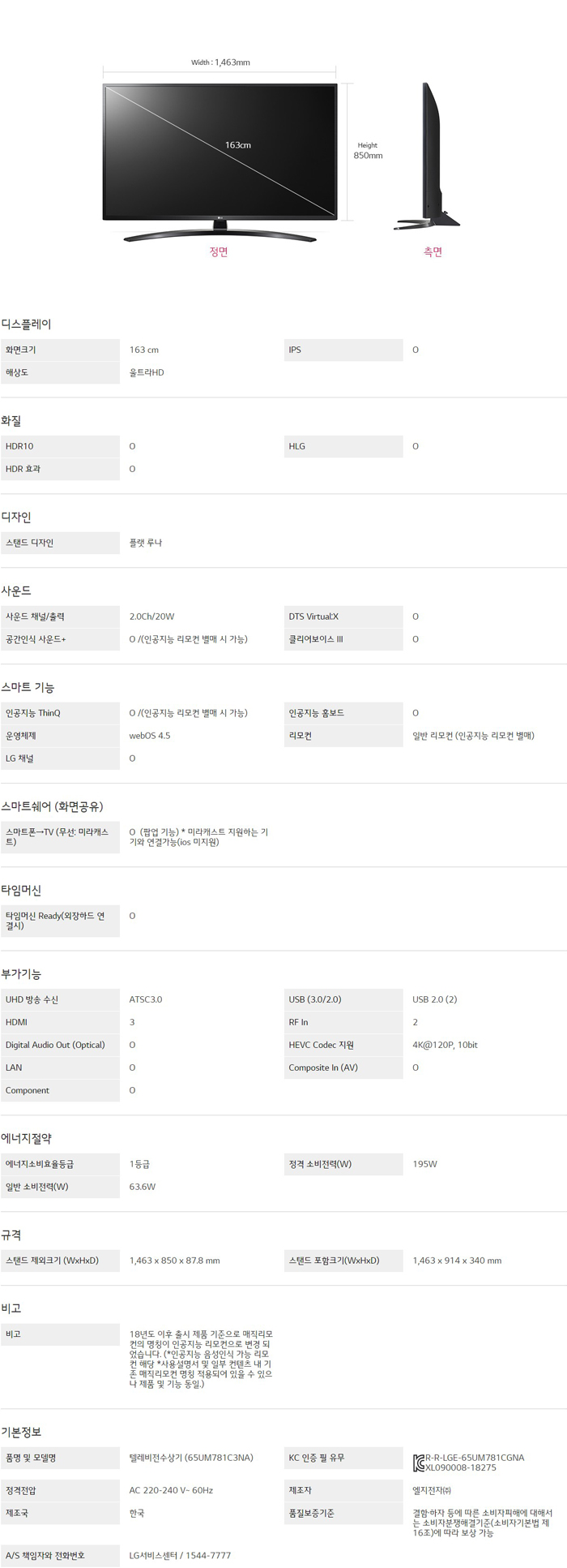 LG 울트라 HD TV AI ThinQ 65UM781C